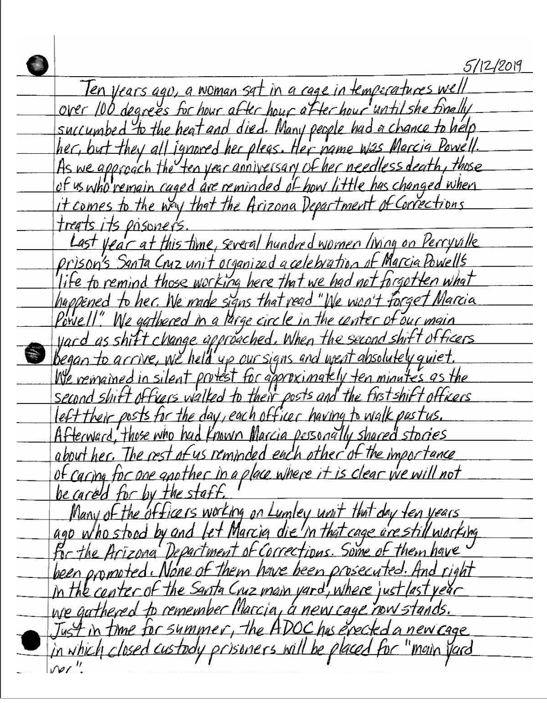 Ten years ago on May 20, 2009, Marcia Powell died as a result of being held in an outdoor cage at Perryville Women’s Prison in extraordinary heat for four hours in the in the Arizona sun. She’d been serving a 27-month sentence for prostitution. If you don’t remember this story, you can read about it here. You can also learn more by watching No Human Involved, PJ Starr’s documentary about this horrifying violation of human rights through state violence.