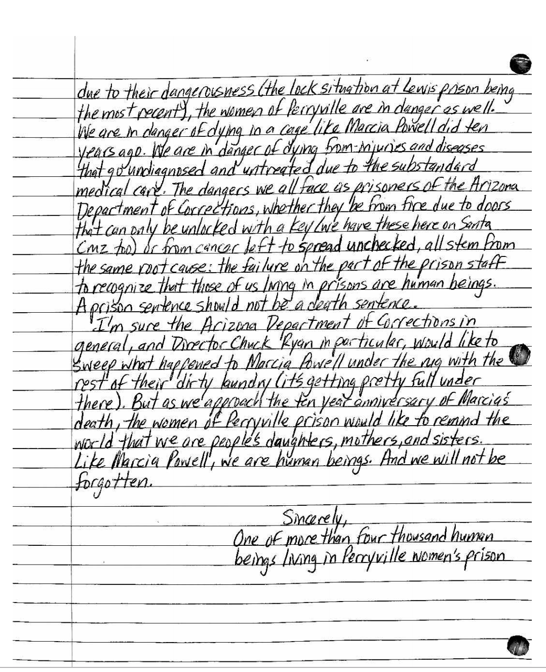 Today, though, what I want you to know is that the women of Perryville Women’s Prison still remember Marcia, and they recently held a protest in recognition of her death at the hands of the state. The letter below describes their protest and details some of the conditions which still haven’t changed. I received this letter from Starr, and she said that the women who sent it to her asked that it be widely shared.